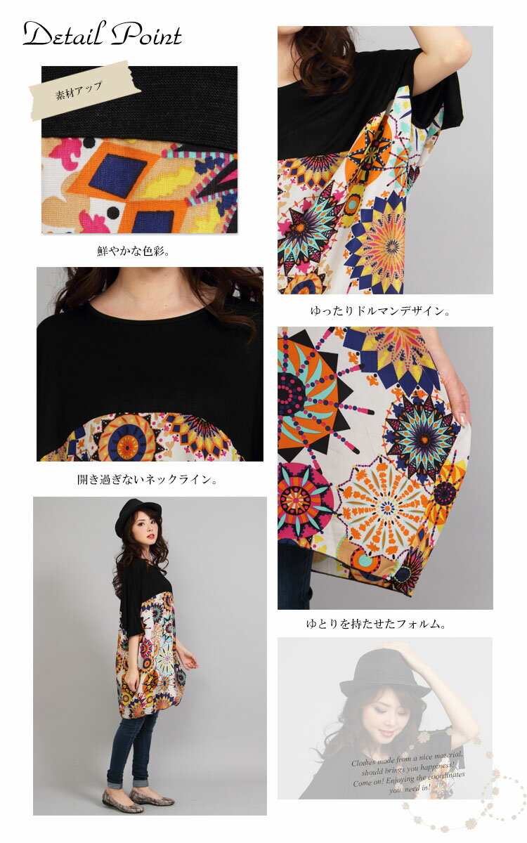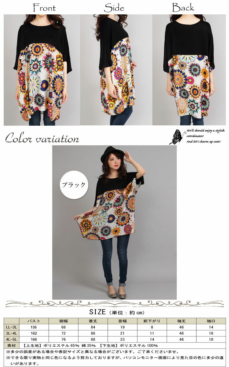 【LL-5L】ボタニカル柄チュニック 大きいサイズ レディース トップス チュニック 半袖 半袖チュニック 半そで 柄物 派手柄 幾何学模様 ビタミンカラー 春服 夏服 秋服 春夏 薄手 オススメ LL 2L 3L 4L 5L XL XXL LLサイズ 13号 15号 17号 19号 ブラック 黒 black