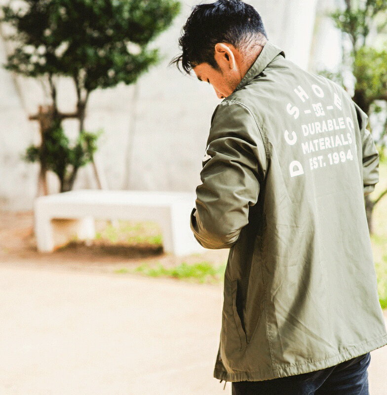 袖や前後の見頃にエッジの効いたロゴプリントを配し、全体にシンプルかつリズムカルな流れをデザインしたライトジャケットです。